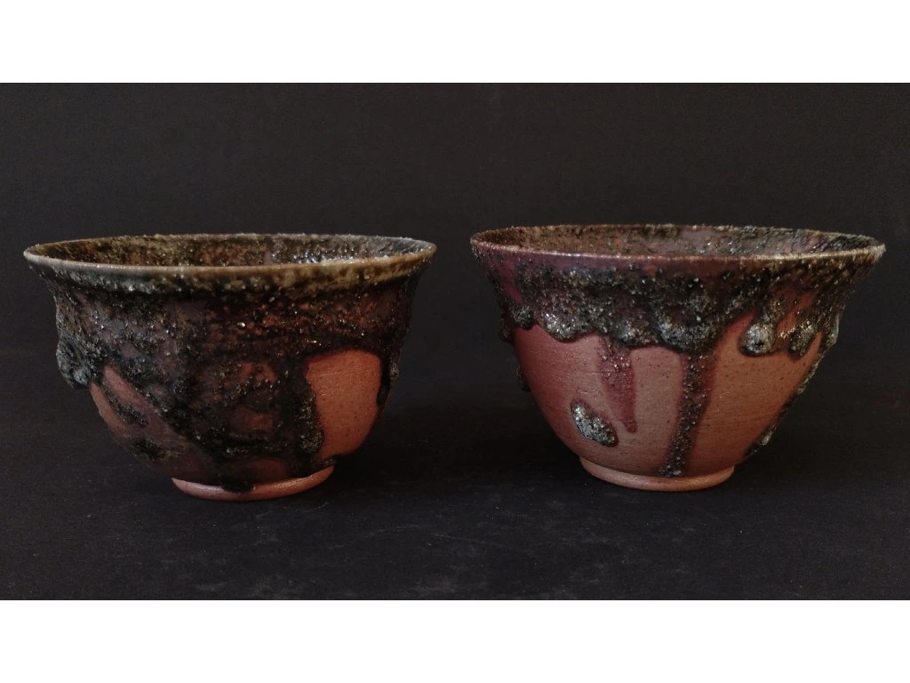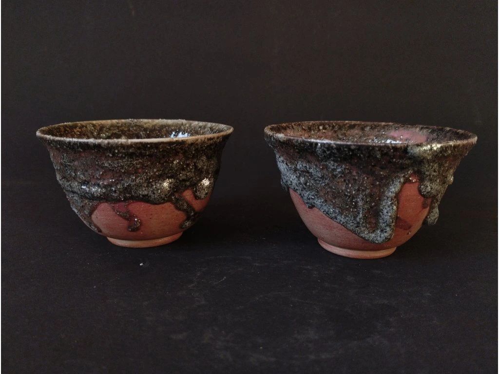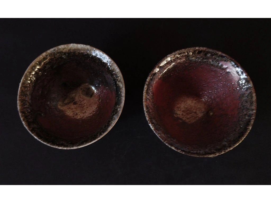 Ke konvičce patrí i dvě čajové misky uvnitř i vně taktéž glazovány glazurou ze žuly. Jedna miska se zdá malinko menší, ale rozměry mají zhruba stejné: výška 5,5 cm, horní průměr 9 cm a každá má objem 150ml.