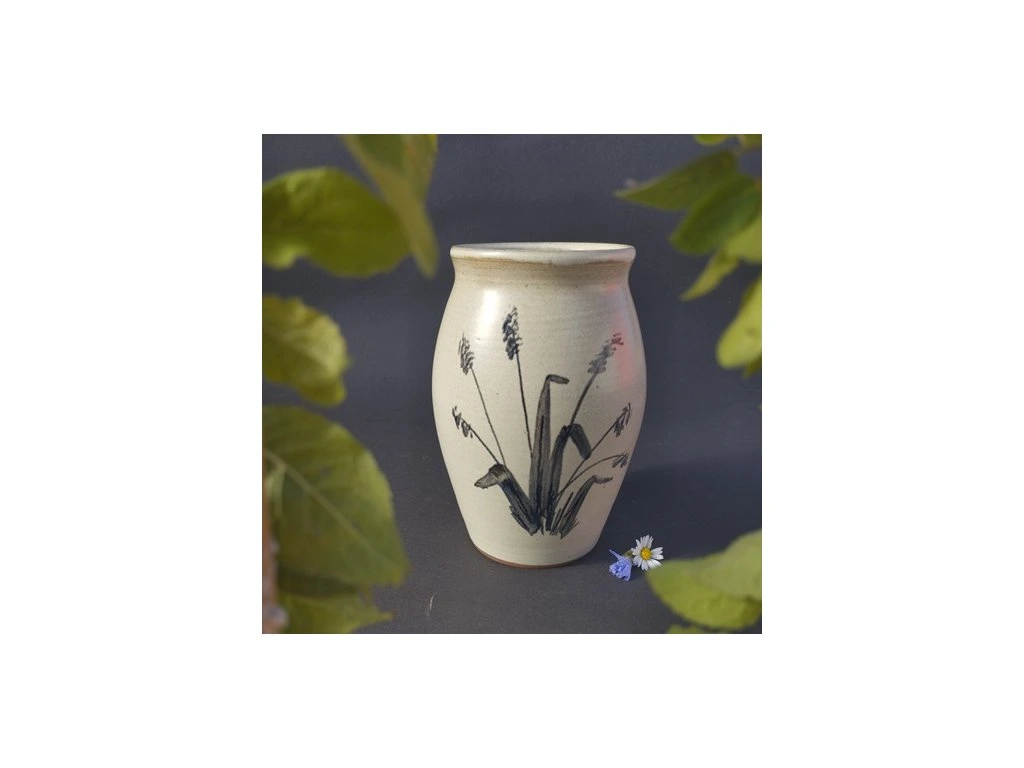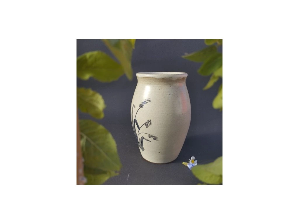 Váza je točená na kruhu a malovaná kobaltem do syrové glazury, která má šedou matnou barvu. Je perfektně slinutá, takže mokrých koleček na ubruse se nemusíte obávat. Objem je cca 800ml, výška je 15 cm.
